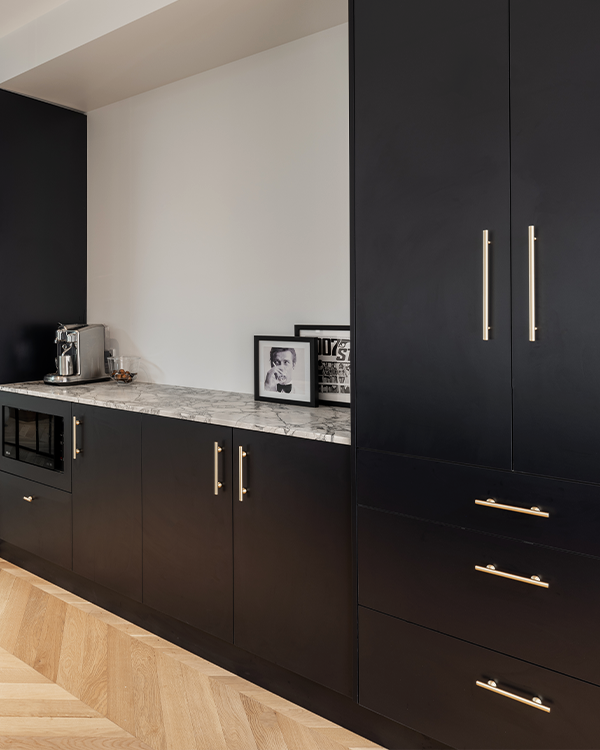 Handsome black cabinetry can be found throughout the project, anchoring the crisp white walls and expert use of glass and light. In the shared office, we first glimpse Passio Interiors' Cassia Handles. The Cassia T-Knobs on their own are an actual work of art; a stunning bar of warm metal, balanced on a perfect sphere. The Cassia hardware line echoes surrealism and playfulness while still remaining poised and refined; it's not often we see this type of creativity in this most important of design choices.