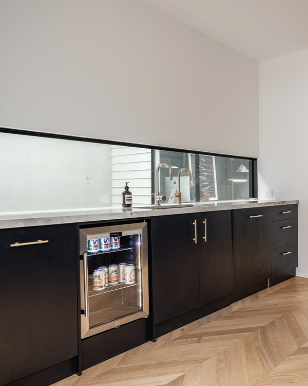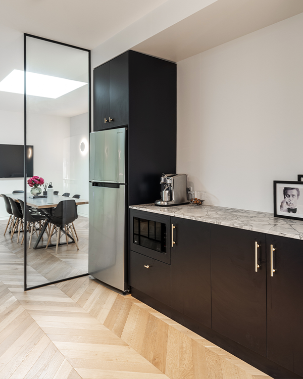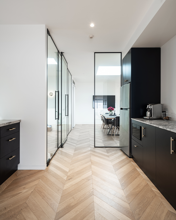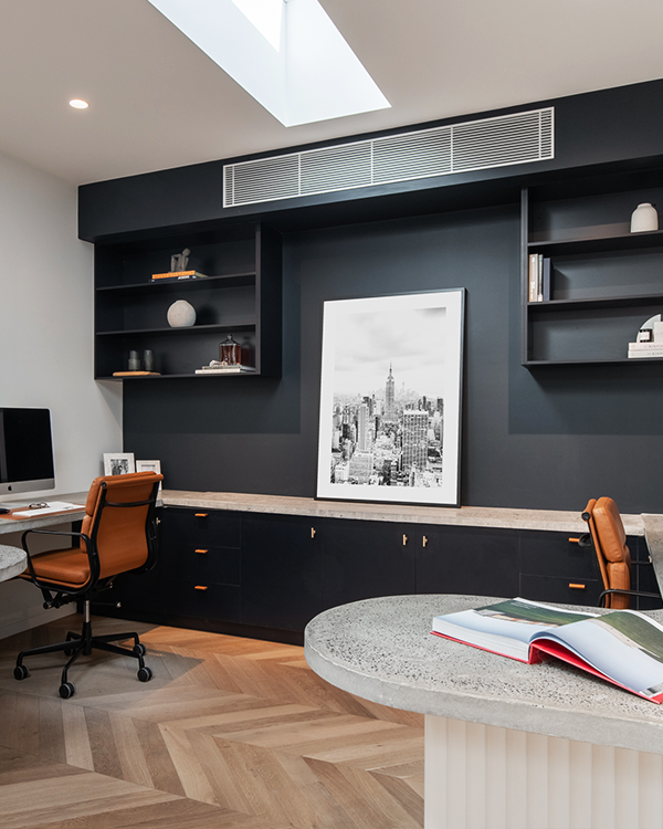 This contemporary office is one for the books; imagining a more expertly executed project is a difficult, if not impossible, task. Firstly, the layout and use of space are marvellous, allowing an open concept shared workspace in a relatively modest footprint as well as a more private shared office, kitchenette and boardroom. The space also hits a high note in mixing modern and moody elements like the dark cabinetry, alongside gorgeous warm aspects like the chevron patterned wood floor and our Cassia Solid Brass handles in the Satin Brass finish.