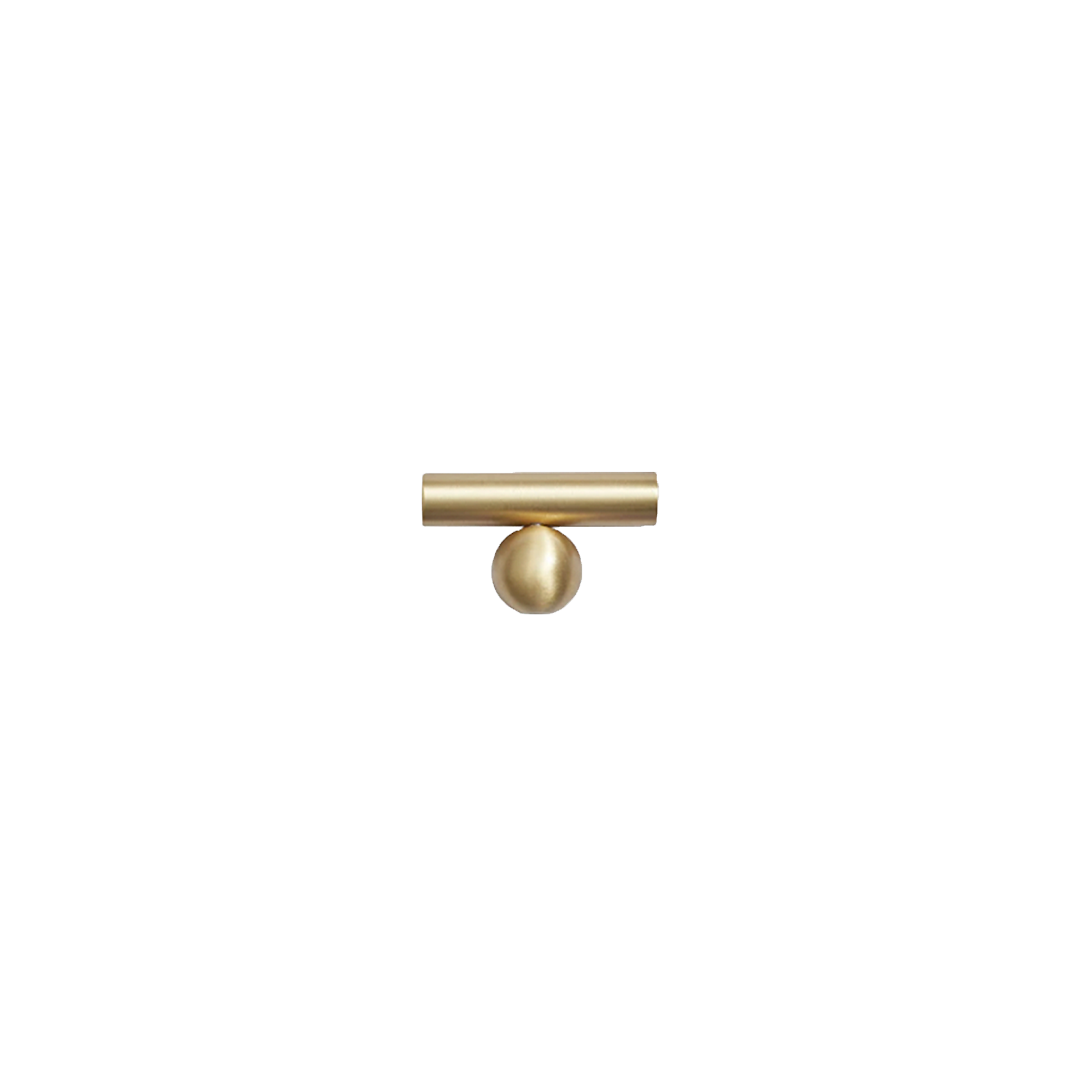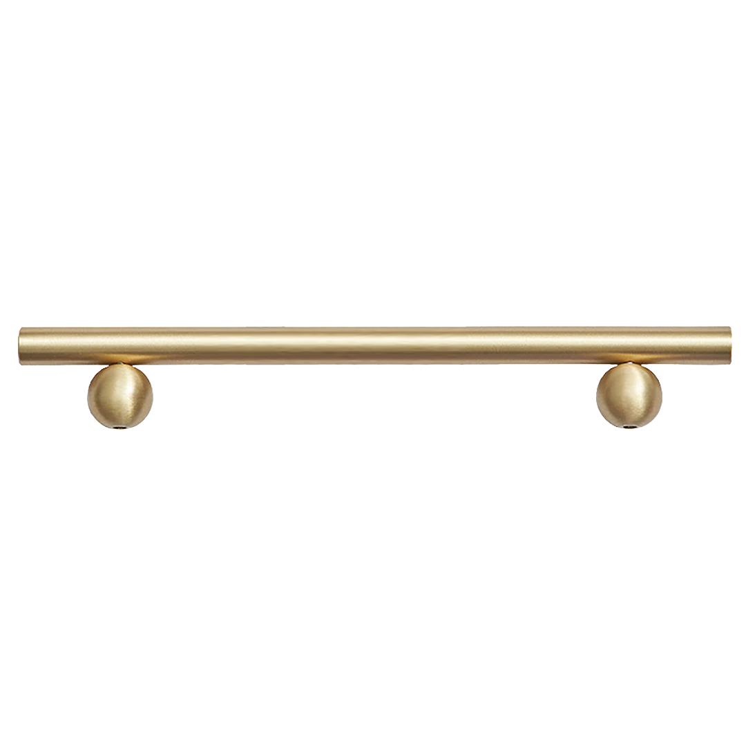 The weighty, elongated Cassia Handles continue to infiltrate the kitchen, flanking the larger cabinets and drawers. This time, the warm metal bar rests on two polished spheres that seem to float on the cabinet face.
