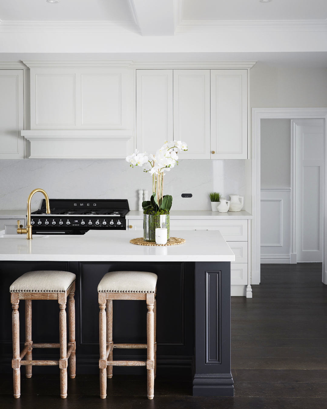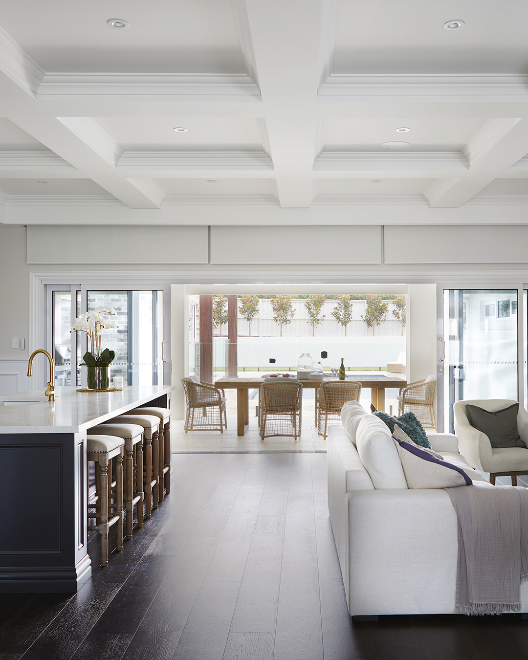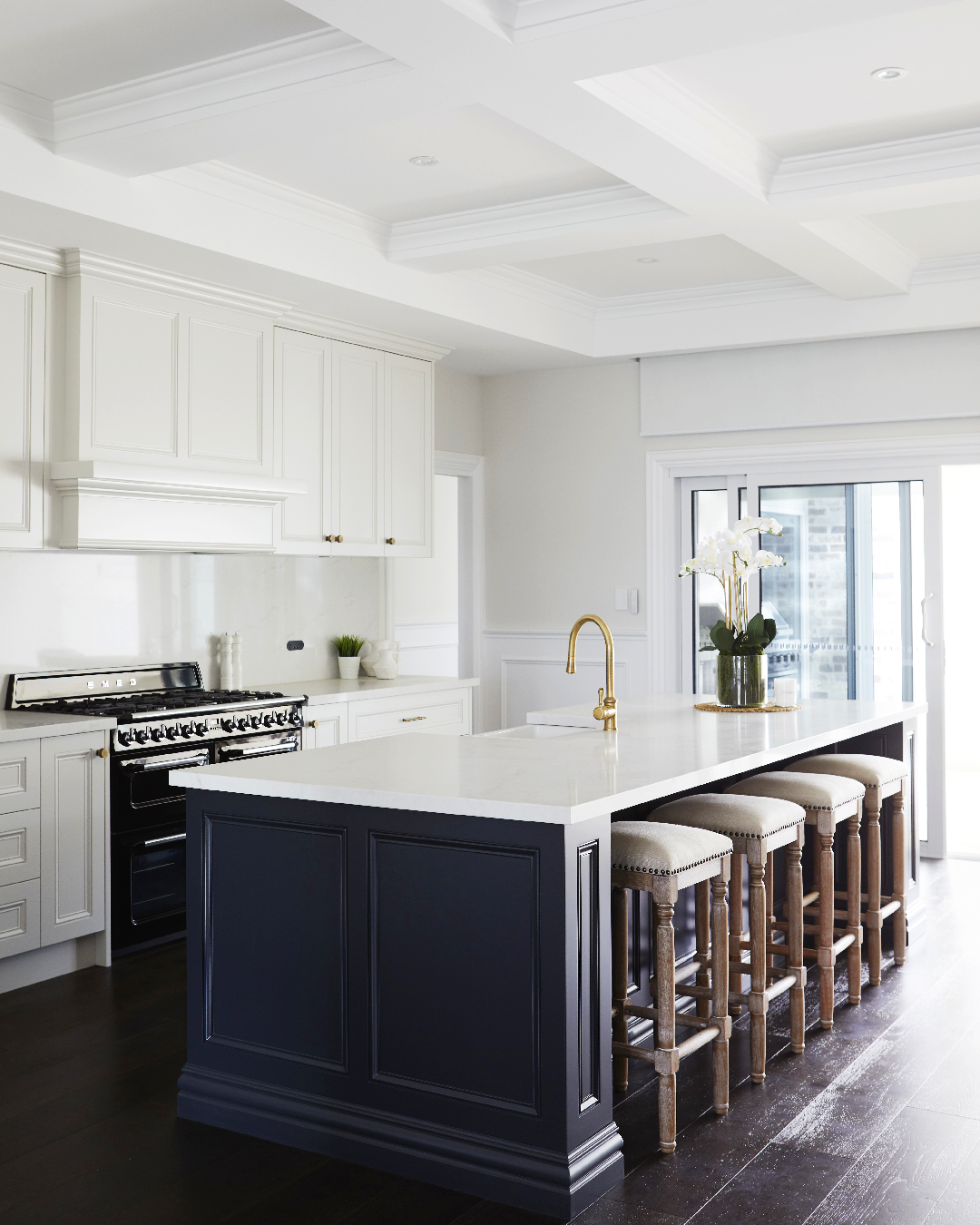 The kitchen, our collective epicentre, persists in reflecting the classic contemporary theme. Traditional cabinetry encapsulated with hearty trim fills the space, and a coffered ceiling stretches the span of the open-concept grand room. The dark blue of the island, an incredibly classic colour choice, offers up a sleek white marble countertop subtly veined with dark grey, which sits rather imposingly across from bright white upper and lower cabinetry. Embellished, upholstered wooden stools bring a softness to the island and the kitchen overall while the deep and dark wood flooring grounds and accentuates this space and every other space you can find it.