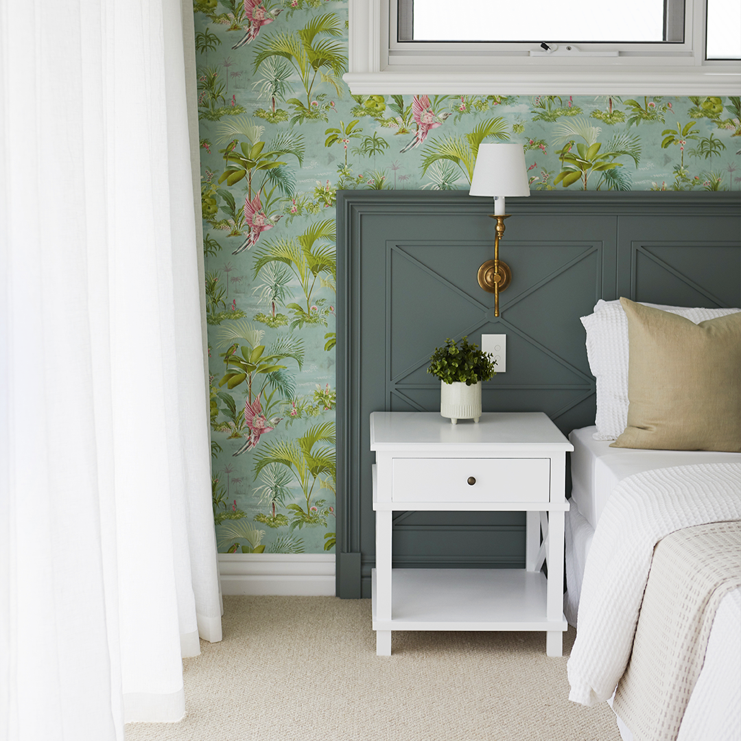 As we continue, we enter paradise as promised, with a master bedroom and bath that reflects the tropical nature of the home's namesake. The lush wallpaper, featuring green palms and pink birds on a blue backdrop, brings the walls a bold splash of colour and a sense of whimsy that feels like fresh air and compliments the rest of the home. The colour and natural elements the wallpaper brings remind us of the past, but with the recent resurgence of bold patterned wallpaper, it feels decidedly contemporary.