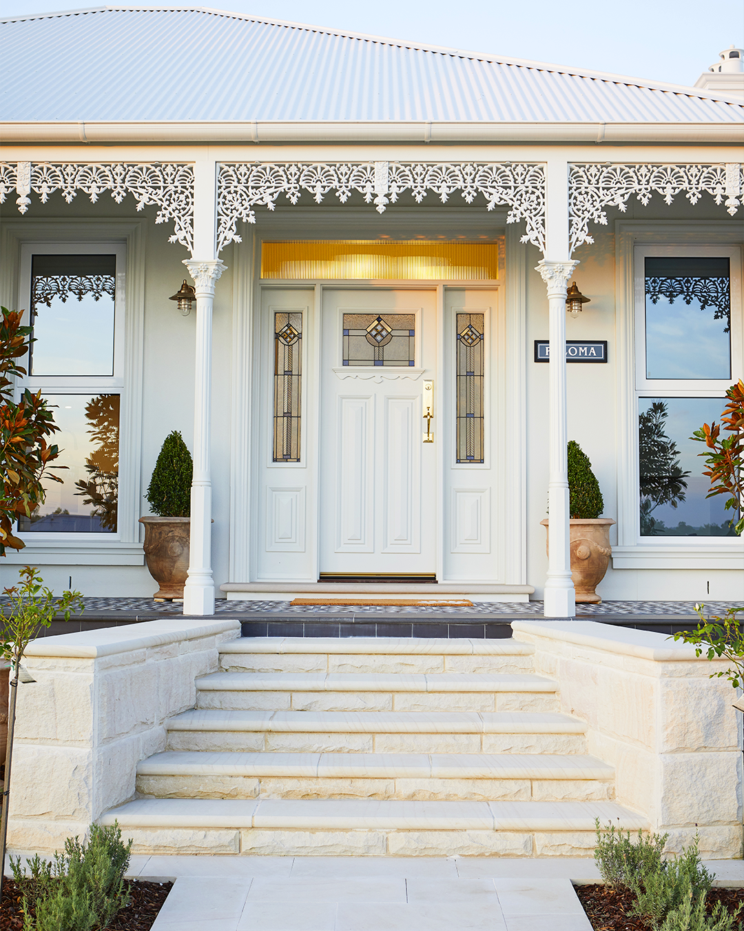 At first glance, it's clear that this home plans to sweep us off our feet. Our initial taste of federation meets classic contemporary is displayed for all to see through the exquisite exterior entryway. The entryway boasts a covered front porch lined with white iron lacework, a hallmark of federation architecture that feels even more stunning when we remember that its original purpose was to be beautiful yet practical, offering us style while allowing shade and breeze on a hot day. In contrast, we see other shapes and materials not typically paired with these elaborate characteristics. Minimalist windows with sleek white trim border both sides of the classic front door. Modern stonework and a cool tin roof round off our welcome into this home, demonstrating that the marriage between contemporary and classic themes remains strong, always continuing to influence and impress us.