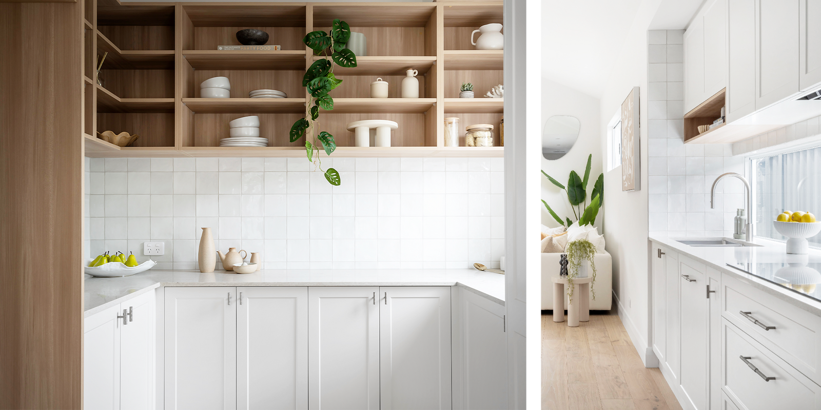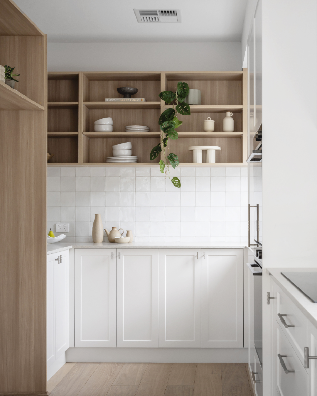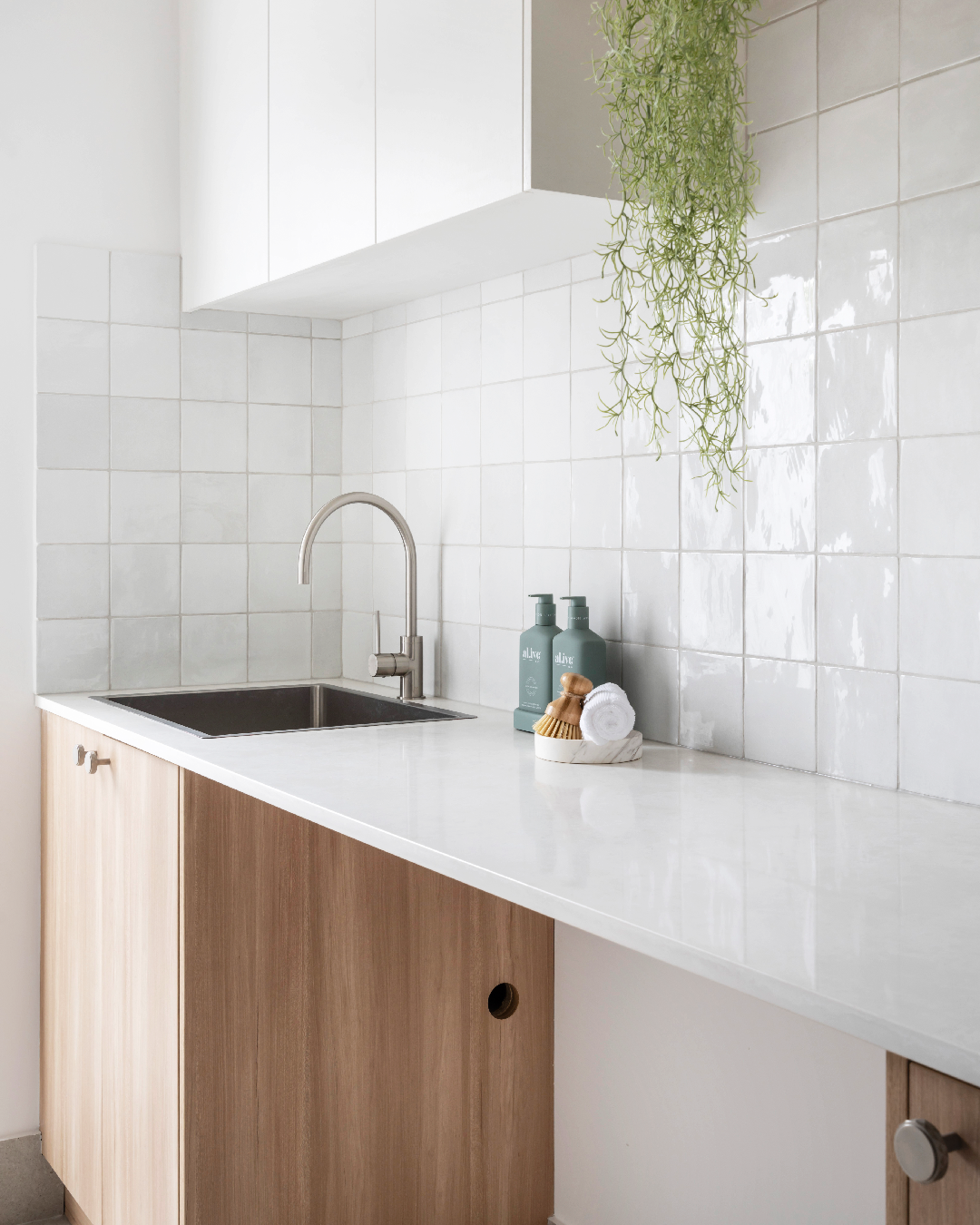 The laundry room also employs the Polo Handle vertically in the same nickel finish on tall white cabinets. We also see the Polo Knob utilised on the lower oak cabinets. These knobs boast the same nickel finish and are also dressed with the gorgeous diamond-cut detailing; these, paired with the soft grain of the oak, make for a truly special union.